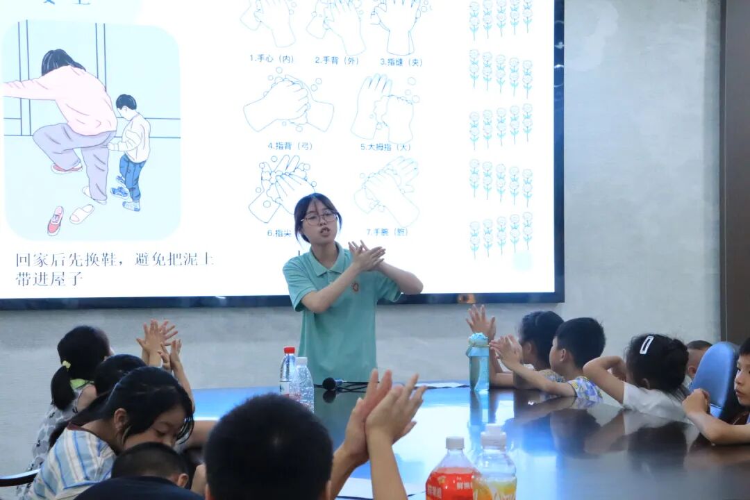 活动现场,志愿者许晴围绕用电用火安全、防磕碰防拐骗、饮食卫生安全三大板块展开教学。从识别插座过载风险、检查燃气管道隐患,到传授“不给陌生人开门、不吃陌生人食物”等“六不”防拐知识,再到示范“七步洗手法”,讲解内容紧密贴合家庭生活场景。教学过程中穿插互动问答,有效激发了孩子们的学习兴趣,让安全知识在交流中入脑入心。
