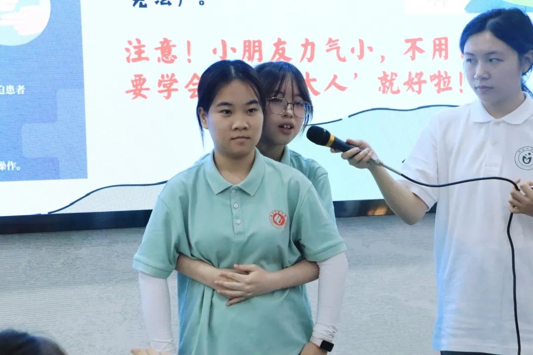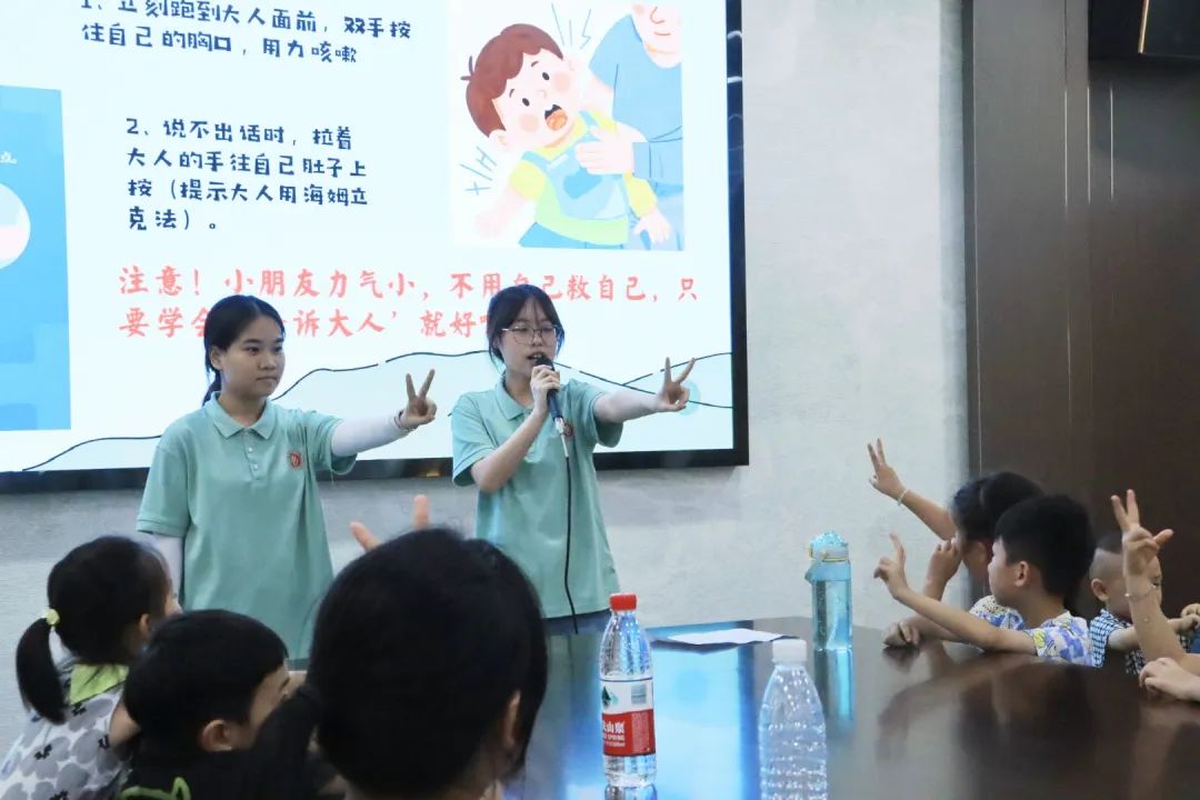 志愿者许晴、谢欣奕通过情景模拟深化教学效果。在演示“海姆立克急救法”时,她们将操作步骤编成“剪刀、石头、布”的趣味口诀,帮助孩子快速掌握异物卡喉的应对方法;在“煤气泄露”情景演练中,通过“闻到煤气味能否开灯”等提问,引导孩子们在沉浸式体验中辨别错误做法,学习正确处置流程。