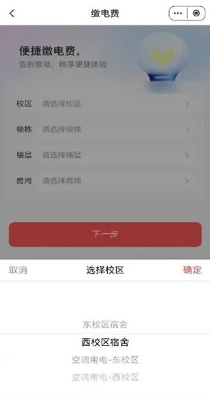 第二步根据实际情况填写相应的校区、楼栋、楼层和房间(这里要注意空调电费需要单独支付,在填写校区时可选择)