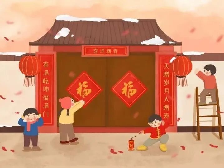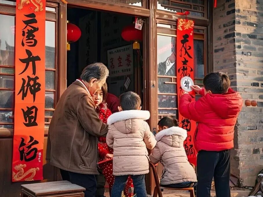 贴的时候要注意:上联贴右侧、下联贴左侧,横批贴门楣正中;春联多为红底黑字或金字,寓意驱邪避灾、迎祥纳福,为家宅增添喜庆氛围。