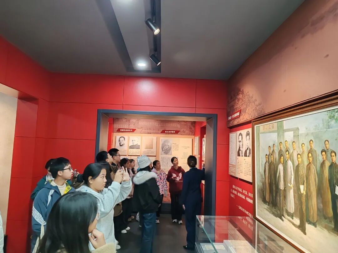 参观过程中,同学们认真聆听讲解,驻足凝视史料文物与历史影像,时而低声交流感悟,时而在重要历史节点前驻足思考。那些泛黄的文献、珍贵的照片、复刻的历史场景,将大家带回了那个战火纷飞却又热血沸腾的年代,让大家真切感受到革命先辈“为有牺牲多壮志,敢叫日月换新天”的豪情与担当。