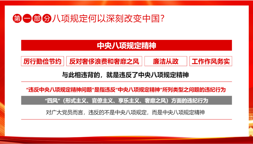 党课现场,授课人从“八项规定何以深刻改变中国”的深入剖析,到对中央八项规定精神中“厉行勤俭节约、反对奢侈浪费和奢靡之风、廉洁从政、工作作风务实”等要点的详细阐释,授课人以深入浅出的方式,结合实际案例,生动解读中央八项规定精神内涵及其深远意义。强调了党中央坚持不懈推进八项规定精神贯彻落实,坚决破除特权思想、特权行为,推动党的建设在自我革新中蓬勃发展。