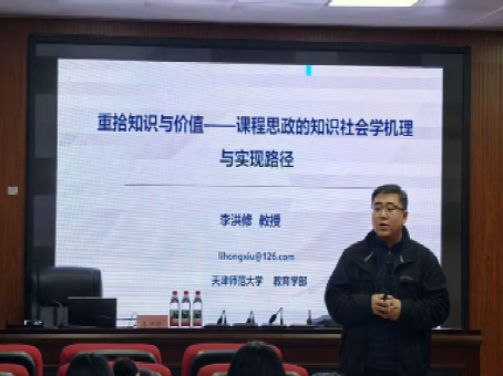首场讲座中,李洪修教授以《重拾知识与价值——课程思政的知识社会学机理与实践路径》为主题,从知识社会学视角深入解读课程思政的内在逻辑与实现路径。他结合伯恩斯坦教育符号理论,系统剖析了课程知识在生产、再脉络化、再生产三大场域的运行机理,强调知识本身蕴含的价值导向与育人使命,为我院进一步推进课程思政建设、落实立德树人根本任务提供了扎实的理论支撑与实践方向。